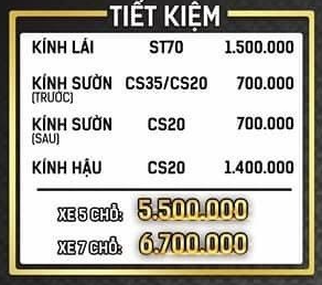 Kính lái – ST70 – 1.500.000 Kính sườn trước – CS35/CS20 – 700.000 Kính sườn sau – CS20 – 700.000 Kính Hậu – CS20 – 1.400.000